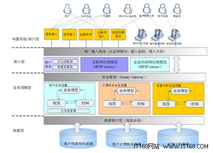 其中,外圍系統(tǒng)/用戶層主要指系統(tǒng)相關(guān)的外圍系統(tǒng),以及業(yè)務(wù)受理、系統(tǒng)管理、綜合查詢、繳費(fèi)、統(tǒng)計(jì)報(bào)表、帳務(wù)管理等與客戶或操作人員交互的應(yīng)用系統(tǒng)界面。接入層為最終客戶提供統(tǒng)一的客戶接觸、服務(wù)平臺(tái),為各個(gè)營(yíng)銷渠道服務(wù)人員提供良好的工作平臺(tái),支撐其為客戶提供優(yōu)質(zhì)服務(wù),同時(shí)為其它外圍系統(tǒng)和機(jī)構(gòu)提供實(shí)時(shí)、定時(shí)批處理接口。業(yè)務(wù)邏輯層(應(yīng)用層)是系統(tǒng)的最核心部分,它接收來自表現(xiàn)層的功能請(qǐng)求,是實(shí)現(xiàn)各種業(yè)務(wù)功能的邏輯實(shí)體,如業(yè)務(wù)受理中的業(yè)務(wù)新裝、開/停機(jī)、業(yè)務(wù)變更以及話費(fèi)查詢、報(bào)表統(tǒng)計(jì)計(jì)算等。數(shù)據(jù)層用于存放并管理各種系統(tǒng)數(shù)據(jù),如客戶資料數(shù)據(jù)、資源數(shù)據(jù)、銷售數(shù)據(jù)、統(tǒng)計(jì)分析數(shù)據(jù)等。