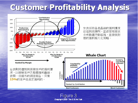 圖3右下角的鯨狀圖進(jìn)一步地說(shuō)明了情況:它根據(jù)客戶分配成本,而更清楚地看到客戶收益性。行動(dòng)成本計(jì)算或ABC可以使確保您的業(yè)務(wù)實(shí)現(xiàn)贏利的關(guān)鍵成本更清楚易懂。讓我們看一個(gè)例子,來(lái)比較兩種獲得和保持手機(jī)用戶的不同的方法。你將看到該高水平分析法可以很充分地使對(duì)呼叫中心利潤(rùn)的基本要素有更深的理解。