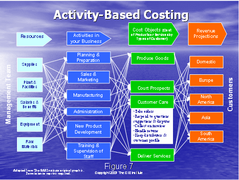 相關(guān)的是,使用傳統(tǒng)的成本和通過一種系統(tǒng)的合理的方式把該成本分配到各個行動上去。這是它們自身的科學(xué),如果你擁有數(shù)字的頭腦,你可以確定一個計劃,該計劃把企業(yè)的成本分配到圖6右手邊所示的不同的行動上去。這是一個關(guān)鍵的步驟。