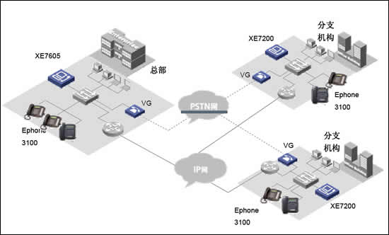 當企業(yè)存在多個大型分部的時候,如一個國際性公司。則可以在各個分部部署XE7000冗余方案,每個分部維護獨立的本地用戶信息。各小分支機構的IP語音終端可以直接注冊到本地XE7000上,從而實現(xiàn)整網的分布式部署。