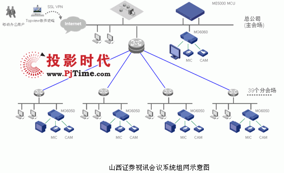 本套系統(tǒng)采用H3C ME5000 MCU+MG6060+MG6050的組網(wǎng)模式,總公司會場采用1臺MG6060,營業(yè)部會場采用39臺MG6050,實現(xiàn)了2M帶寬下的高清會議的連接,系統(tǒng)構(gòu)架圖如下: