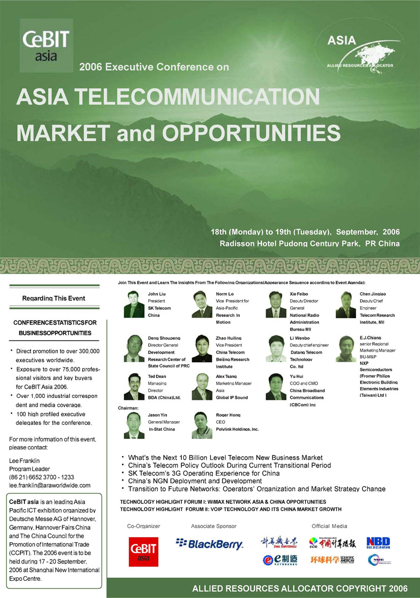 2006亞洲信息及通信技術(shù)展覽會(huì),即亞洲CeBIT展將于今年9月17日至20日在上海新國際博覽中心召開。由中國國際貿(mào)促會(huì)電子信息行業(yè)分會(huì)與德國漢諾威展覽公司聯(lián)合主辦的這一展會(huì),近300家國內(nèi)外廠商參展,將分為數(shù)字設(shè)備及系統(tǒng)、商務(wù)應(yīng)用、通信三大展區(qū),多方位展現(xiàn)ICT行業(yè)的最新趨勢,并成為業(yè)內(nèi)廠商的專業(yè)貿(mào)易平臺(tái)。本次CeBIT展會(huì)期間(9月18、19日兩天),將在浦東證大麗笙酒店召開“2006亞洲通信及信息市場管理層論壇”。包括中國國家信息產(chǎn)業(yè)部、中國電信、韓國SK電訊、BDA中國等多家政府機(jī)關(guān)、運(yùn)營商、制造商將參加本次論壇,并做重要發(fā)言。