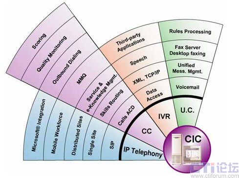 CIC平臺(tái)是一套符合呼叫中心營(yíng)運(yùn)所需,且有其營(yíng)運(yùn)所需模塊的All In One設(shè)備,如數(shù)字交換機(jī)、PABX、CTI、IVR、ACD、 Screen Pop、數(shù)據(jù)庫(kù)整合、網(wǎng)站整合服務(wù)(Web Call Back、Web Chat、VON、E-mail)、傳真服務(wù)器、傳真自動(dòng)回復(fù)、Dialer、Scripter、在線錄音...等所有功能,采用CIC平臺(tái)的系統(tǒng)比基于傳統(tǒng)PBX的系統(tǒng)更加易于維護(hù)。 CIC為企業(yè)體帶來(lái)一個(gè)功能齊備,技術(shù)人員及值機(jī)人員可以自己完全掌握的Call Center系統(tǒng),并且也是一個(gè)最上算投資報(bào)酬率ROI(Return Of Investment)的解決方案。