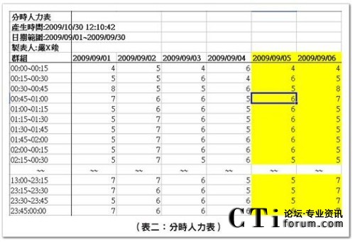 分時人力表在管理上有重要的地位,用于檢視時間內排定的出席人數,通常是將此數據與預測的話務需求做比對,檢查排定人力數與話務曲線的擬合度。在現場管理時,則用于小休調度,避免小休人數過多,使出席人數降到關鍵少數的臨界點下,造成服務水平大幅跌落的狀況發(fā)生。