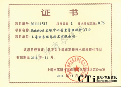 CTI論壇(ctiforum)12月7日消息(記者 張潔):2011年的最后一個月,寶東公司傳來又一好消息,公司的開發(fā)團隊自主開發(fā)研制的針對呼叫中心客服的質檢軟件“Datatool 客服中心質量管理軟件(簡稱DTQM)”經(jīng)過市高新技術轉化項目認定辦公室層層審報審批,最終經(jīng)審定,被認定為市高新技術成果轉化項目。
