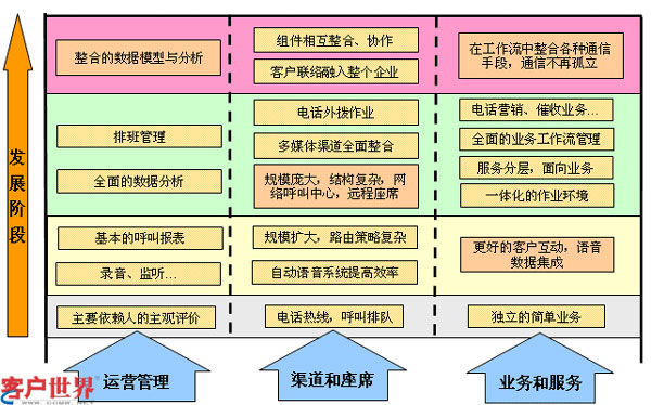 如圖一所示,國(guó)內(nèi)大多數(shù)企業(yè)呼叫中心基本經(jīng)歷了三個(gè)階段的發(fā)展,在呼叫中心建設(shè)初期,往往只是建設(shè)成電話(huà)熱線(xiàn),座席人員接通電話(huà),通過(guò)與客戶(hù)交流,利用簡(jiǎn)單獨(dú)立的呼叫中心應(yīng)用系統(tǒng),完成咨詢(xún)和接受訂單工作,在這階段對(duì)呼叫中心來(lái)講基本沒(méi)有什么管理,主要靠人的主觀評(píng)價(jià)來(lái)實(shí)現(xiàn)粗放運(yùn)營(yíng)。