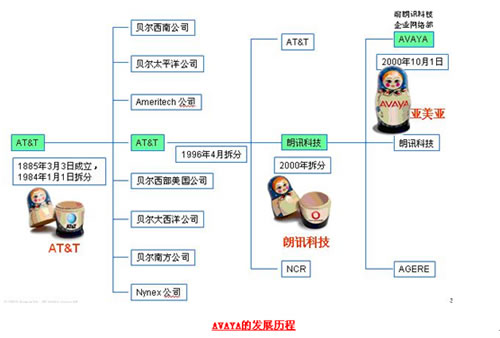 Avaya的歷史最早可以追溯到1885年成立的美國電話電報公司(AT&T),AT&T在1994年一分為AT&T、朗訊科技、NCR等三家公司,而Avaya于2000年10月從朗訊科技的企業(yè)通信部門剝離獨(dú)立上市(代碼AV),再后來即上文中提到的Avaya被兩大私募德州太平洋集團(tuán)和銀湖合伙組成的財團(tuán)用82億美元私有化。