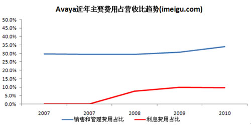 銷售和管理費(fèi)用以及利息費(fèi)用是Avaya開支最大的兩塊費(fèi)用,管理和銷售費(fèi)用一直穩(wěn)定在30%左右。Avaya私有化之前的2006、2007財年的利息費(fèi)用分別為300萬美元、100萬美元(對應(yīng)著51.48億美元和52,78億美元的營收),利息費(fèi)用占比不到1%,私有化之后利息費(fèi)用急劇飆升(私有化相關(guān)債務(wù)的增加),2008、2009、2010財年利息費(fèi)用分別為3.77億美元、4.09億美元、4.87億美元,成為束縛Avaya盈利的關(guān)鍵因素。