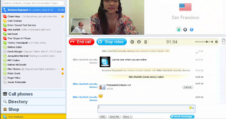 顯著的一個(gè)大改變是,軟件界面變成了全屏,而視頻窗口又占據(jù)了絕大部分版面。在視頻中還有“畫(huà)中畫(huà)”的功能,小的畫(huà)面可以任意移動(dòng)?梢哉f(shuō)skype從一部網(wǎng)絡(luò)電話,變成了一部網(wǎng)絡(luò)可視電話。或者,好像感覺(jué)是在視頻聊天室中一樣。