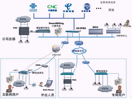 - 中心的X5-IPBX系統(tǒng)可以服務(wù)于互聯(lián)網(wǎng)用戶和企業(yè)內(nèi)部數(shù)據(jù)專網(wǎng)用戶,實現(xiàn)雙網(wǎng)匯接,使得不同網(wǎng)絡(luò)中的用戶可以實現(xiàn)IP電話通信。