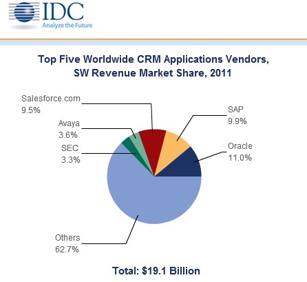 根據IDC的調查數據顯示,目前就CRM市場來說,Salesforce和SAP正呈現出一種超越甲骨文,奪取領頭羊寶座的趨勢。
