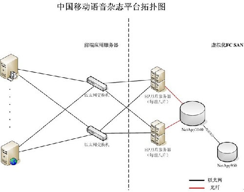 其中,NetApp FAS3140 配有 6 個 450GB 的 FC 磁盤和兩個 300GB FC 磁盤,裸容量為 46TB,用于運行中國移動的語音雜志業(yè)務(wù),采用 Socket 連接。NetApp FAS2050 則內(nèi)置有 12 塊1TB SATA 磁盤,裸容量為 12TB,主要用于測試高陽公司 Oracle 數(shù)據(jù)庫和網(wǎng)站應(yīng)用等。