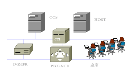 智能化網(wǎng)絡(Intelligent Network)、排隊機(ACD)、計算機語音集成(CTI)、自動語音/傳真響應設備(IVR/IFR)、業(yè)務系統(tǒng)主機HOST、座席(Agent)、信息板(Wall