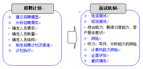 東軟呼叫中心充分挖掘東北地區(qū)豐富的韓語人才資源,通過多種招聘渠道滿足項(xiàng)目的人才需求。東軟自身的教育機(jī)構(gòu)--東軟信息學(xué)院也可以培養(yǎng)專業(yè)的韓語人才,另外,東軟信息學(xué)院與韓國某大學(xué)進(jìn)行戰(zhàn)略合作,通過為韓國留學(xué)生提供呼叫中心實(shí)習(xí)機(jī)會及漢語培訓(xùn)等,方式,吸引數(shù)名高素質(zhì)韓國大學(xué)生加入呼叫中心,充分滿足該項(xiàng)目對專業(yè)人才的需求。