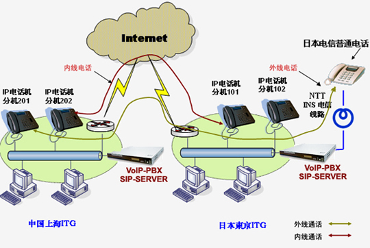 上海愛吉研發(fā)的VoIP-PBX軟交換系統(tǒng)已經(jīng)成功地在上海愛吉和日本愛吉以及日本的客戶間實(shí)施。目前應(yīng)用上海愛吉生產(chǎn)的VoIP-PBX產(chǎn)品,可以實(shí)現(xiàn)從上海愛吉的任意IP電話機(jī)撥打內(nèi)部分機(jī)號,例如:101,成功實(shí)現(xiàn)從Internet互聯(lián)網(wǎng)接通位于日本東京的日本ITG或日本OKI公司的IP電話機(jī),而不產(chǎn)生任何的電信費(fèi)用。另外,目前通過日本的NTTINS 交換機(jī),還實(shí)現(xiàn)了從上海愛吉的IP電話機(jī)可以撥打日本方面的任意普通電話,即日本電信范圍內(nèi)的任意普通電話,而僅僅產(chǎn)生從日本ITG到日本其它地方的短途或國內(nèi)長途費(fèi)用,而沒有上海到日本的國際長途費(fèi)用。具體的網(wǎng)絡(luò)應(yīng)用圖如下所示: