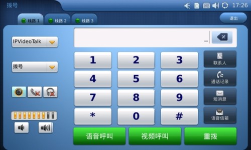 7寸大屏搭配寬大的數(shù)字虛擬鍵盤(pán),讓你的撥號(hào)準(zhǔn)確無(wú)誤。同時(shí)界面的所顯示的通話功能諸如查找聯(lián)系人、查找通話記錄、發(fā)送短消息或者快速進(jìn)入語(yǔ)音信箱等功能也清晰明了?梢园l(fā)現(xiàn)的是,用戶在輸完號(hào)碼之后可自主選擇采用語(yǔ)音呼叫還是視頻呼叫。另外,同潮流網(wǎng)絡(luò)之前的一款視頻電話GXV3140一樣的是,GXV3175也在出廠自帶了一個(gè)IPVideoTalk賬號(hào)。該賬號(hào)是出廠時(shí)就已配置好的,每一臺(tái)電話配備一個(gè)號(hào)碼并顯示在桌面上。也就是說(shuō),用戶在拿到GXV3175并聯(lián)網(wǎng)之后即可使用該賬號(hào)撥打免費(fèi)的視頻電話了。這可是很多廠商所沒(méi)有的特殊功能。下面我們就使用隨機(jī)附送的IPVideoTalk賬號(hào)來(lái)?yè)艽蛞曨l電話。
