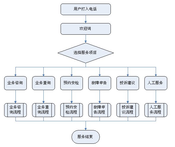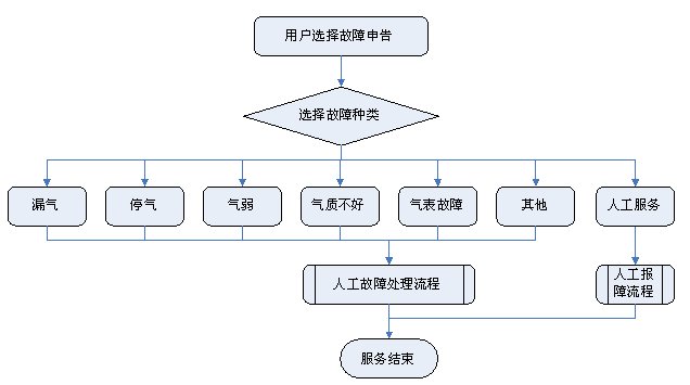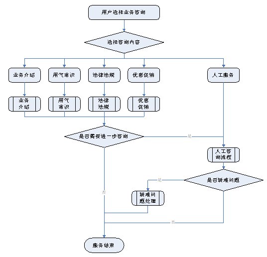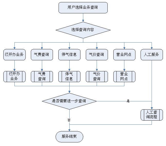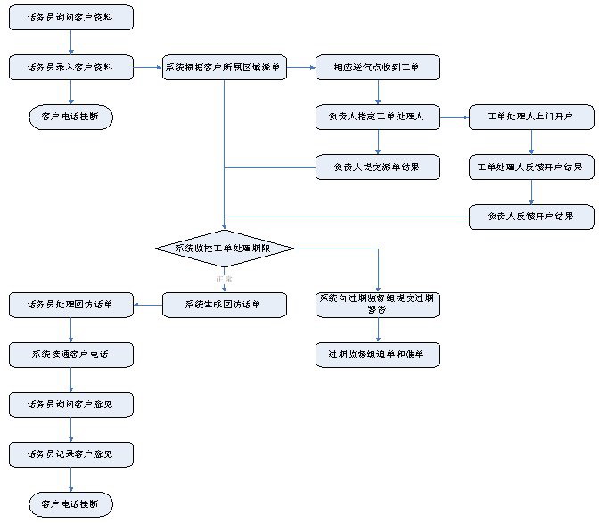 1)業(yè)務(wù)咨詢:用戶通過人工、自動(dòng)語音等方式咨詢有關(guān)政策法規(guī)、資費(fèi)標(biāo)準(zhǔn)、用氣常識(shí)、報(bào)裝方法等,系統(tǒng)以語音、傳真、Email、短消息等方式回復(fù)客戶。