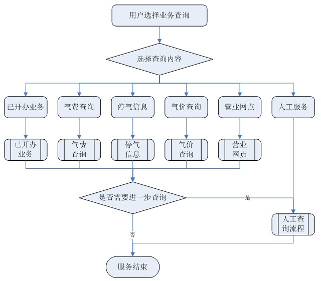 業(yè)務查詢:用戶可通過受理人員或自動語音應答系統(tǒng)根據(jù)用戶要求從數(shù)據(jù)庫查詢資料,然后通過語音方式播報或送到用戶指定傳真機或其他終端設備上。應考慮以后用web方式查詢氣費等數(shù)據(jù),以不動及主體設備方式平滑升級。