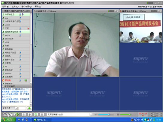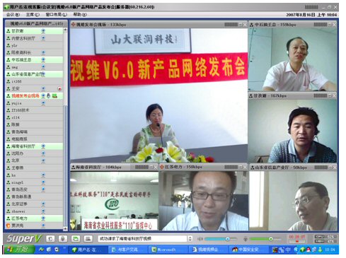 2007年8月16日,視維視頻會議V6.0新產(chǎn)品網(wǎng)絡(luò)發(fā)布會在美麗的泉城濟南舉行,山東省信息產(chǎn)業(yè)廳、濟南市信息產(chǎn)業(yè)局的領(lǐng)導(dǎo)、山東省電信等上級主管部門領(lǐng)導(dǎo),視維產(chǎn)品新老用戶和有視頻會議需求的潛在客戶,國內(nèi)外合作伙伴,IT168、中國計算機報、電腦商報、C114、支點網(wǎng)、計算機世界、CTI論壇、投影時代等國內(nèi)知名媒體100多人參加了這次網(wǎng)絡(luò)發(fā)布會。在此次會議上,山大聯(lián)潤公司通過視頻會議與各地與會者進(jìn)行了良好的溝通,同時這次發(fā)布會開創(chuàng)了用視頻會議發(fā)布新產(chǎn)品的先河。