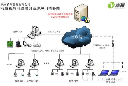 長安轎車大規(guī)模網絡遠程會議和培訓系統(tǒng)由服務器端和客戶端組成,服務器端軟件部署在重慶中心機房,中心機房配置1臺單獨服務器,支持400個客戶端同時在線,負責所有會議和培訓的召集、音視頻交互、加密等工作,長安轎車各部門、轄下各零售點通過WEB方式(包括ADSL、3G無線等多種網絡)即可實現(xiàn)客戶端軟件的自動安裝與升級,配備簡單的攝像頭和話筒之后就可以實現(xiàn)長安轎車以及400多零售點的大規(guī)模工作會議和高清音視頻網絡培訓。網絡拓撲圖如下:
