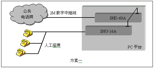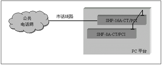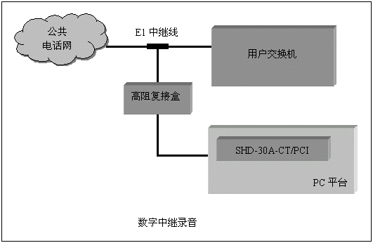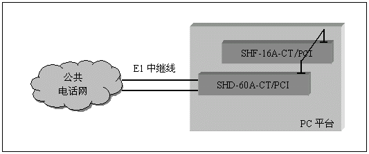 通道數(shù)較多的大中型應(yīng)用系統(tǒng),一般采用數(shù)字中繼線(E1)接入公共電話網(wǎng),三匯公司的SHD系列數(shù)字中繼卡可以提供相應(yīng)的解決方案。SHD系列數(shù)字中繼在一塊卡上集成了E1線接口,語音資源,信令處理等所必須的全部功能,其接入信令處理模塊可處理中國1號信令(SS1),7號信令(SS7),ISDN PRI協(xié)議(DSS1),單塊卡最多可支持4個(gè)E1接入。通過CT-BUS(或ST-BUS)總線,還可以在數(shù)字中繼線上實(shí)現(xiàn)傳真功能。典型應(yīng)用結(jié)構(gòu)如下圖: