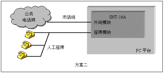 人工座席是呼叫中心(Call Center)一類應(yīng)用的主要組成部分。三匯語音卡對人工座席提供了兩套解決方案:使用SHU系列座席卡,通過交換總線與其它卡互聯(lián),為整個(gè)系統(tǒng)提供座席資源。使用SHT系列模塊化語音卡,在部分通道使用座席模塊,可用單塊卡實(shí)現(xiàn)座席和外線系統(tǒng)。第二種方式特別適用于小型呼叫中心,總機(jī)話務(wù)員等應(yīng)用。三匯公司的座席通道可以直接連接各類普通電話機(jī),利用座席卡配置相應(yīng)的軟件,還可以構(gòu)成板卡交換機(jī),完全取代企業(yè)用戶交換機(jī)。這類應(yīng)用的典型結(jié)構(gòu)如下圖:
