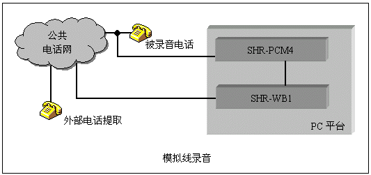 三匯公司的SHR系列監(jiān)控錄音卡可以實(shí)現(xiàn)對電話線路或其它信號源如話筒信號、對講機(jī)等進(jìn)行錄音。模擬線錄音采用高阻抗并線的方式,對被錄音對象無影響。可以檢測電話線上直流電壓、DTMF號碼、FSK/DTMF CallerId等信號。采用配套的高阻復(fù)接盒,SHD系列數(shù)字中繼卡還能完成對數(shù)字中繼線的監(jiān)控錄音,并能分析線路上的信令,從而取得通話狀態(tài)和主被叫號碼。這兩種錄音系統(tǒng)的結(jié)構(gòu)如下圖: