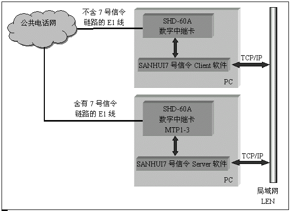 數(shù)字中繼卡上的DSP完成7號信令MTP第一至第三層的信令鏈路處理,由驅(qū)動軟件完成TUP和ISUP層的協(xié)議處理,包含有7號信令鏈路的微機作為server,通過TCP/IP協(xié)議為其它不包含信令鏈路的client提供接續(xù)控制。