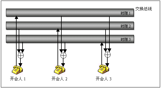 由于會議的資源是分布在各個通道,因此電話會議功能可以具有極大的靈活性,只有一塊卡的小系統(tǒng)也可以擁有電話會議功能,既可以召開所有通道參加的大會議,也可以同時召開一系列參加人數(shù)不同的小會議,會議功能的各項指標(biāo),如會議數(shù)目,會議參加人數(shù),發(fā)言人數(shù)等基本上都不受限制。下圖以一個三方會議的實現(xiàn)說明分布式電話會議的概念。