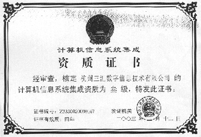 按照《計(jì)算機(jī)信息系統(tǒng)集成資質(zhì)管理辦法(試行)》和《計(jì)算機(jī)信息系統(tǒng)集成資質(zhì)等級(jí)評(píng)定條件(試行)》,經(jīng)信息產(chǎn)業(yè)部計(jì)算機(jī)信息系統(tǒng)集成資質(zhì)認(rèn)證管理委員會(huì)審定,在不久前,信息產(chǎn)業(yè)部公布的計(jì)算機(jī)信息系統(tǒng)集成資質(zhì)證書(shū)企業(yè)名單中,杭州三匯數(shù)字信息技術(shù)有限公司獲得叁級(jí)認(rèn)證。