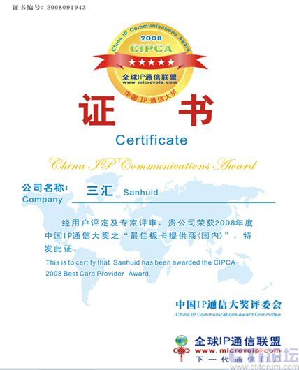 9月19日,在上海盛大舉行的CIPCC中國(guó)IP通信大會(huì)上,杭州三匯摘取了CIPCA 2008年國(guó)內(nèi)最佳語音板卡提供商大獎(jiǎng),體現(xiàn)了杭州三匯在國(guó)內(nèi)語音卡領(lǐng)域的絕對(duì)領(lǐng)導(dǎo)和優(yōu)勢(shì)地位。