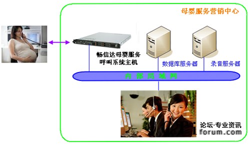 暢信達(dá)母嬰服務(wù)呼叫系統(tǒng)是以母嬰服務(wù)呼叫系統(tǒng)主機為呼叫交換和業(yè)務(wù)受理平臺,選配數(shù)據(jù)庫服務(wù)器和錄音服務(wù)器,采用人工座席發(fā)起呼叫并接聽來電,系統(tǒng)架構(gòu)圖如下: