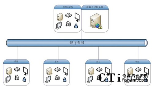 如圖,大新銀行視頻會議系統(tǒng)應(yīng)用規(guī)模為5個點,包括香港、深圳、上海、南京、鎮(zhèn)江,服務(wù)器部署在深圳用來保證香港和內(nèi)地的鏈接效果,服務(wù)器出口帶寬為5M共享,各分會場通過專網(wǎng)訪問服務(wù)器。在這個網(wǎng)絡(luò)平臺上,紅杉樹網(wǎng)絡(luò)視頻會議所提供的高質(zhì)量音視頻圖像、方便易用的文檔、文件共享數(shù)據(jù)功能,使得大新銀行能夠在這個平臺上進行從桌面討論到會議室正式會議等各種規(guī)模的應(yīng)用。在這個平臺上,除了進行日常例會、業(yè)務(wù)交流等常見的應(yīng)用之外,業(yè)務(wù)培訓(xùn)、異地招聘等也是經(jīng)常進行的內(nèi)容。業(yè)務(wù)人員利用數(shù)據(jù)功能,把平常培訓(xùn)很難懂的新銀行產(chǎn)品、費率等進行介紹,節(jié)約了以前培訓(xùn)所花費的大量精力和時間,為新產(chǎn)品迅速占領(lǐng)市場掌握了主動。