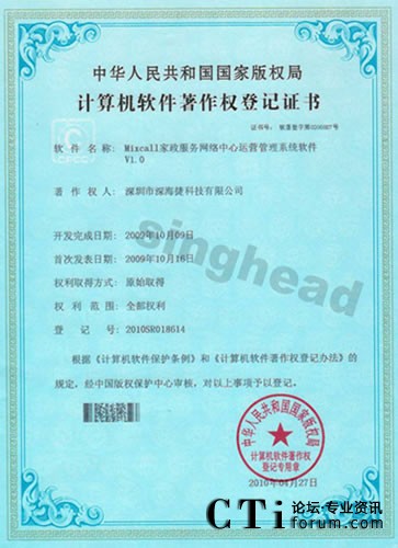 CTI論壇(ctiforum)5月19日消息(記者 楊佳林):2010年4月27日,深圳市深海捷科技有限公司申請的《Mixcall家政服務(wù)網(wǎng)絡(luò)中心運(yùn)營管理系統(tǒng)軟件V1.0》著作登記獲得國家版權(quán)局審核并通過。