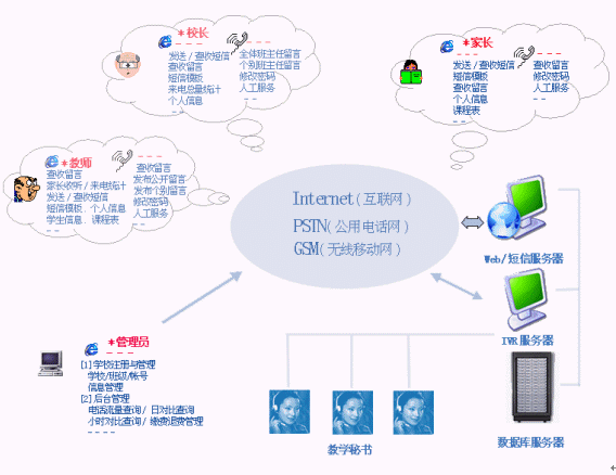 | 班主任留言(電話) | 通過電話直接給全體班主任或個別班主任留言,發(fā)布學(xué)校動態(tài),班主任通知等。 |