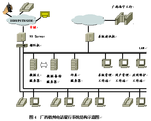 廣西工行推出的第一套銀行呼叫中心系統(tǒng)是在潤(rùn)聲VX綜合信息系統(tǒng)開(kāi)發(fā)平臺(tái)(UNIX版)上,在較短時(shí)間內(nèi)開(kāi)發(fā)成功,首先在梧州分行開(kāi)通運(yùn)行,獲得用戶(hù)的一致好評(píng),并希望與潤(rùn)聲公司進(jìn)一步合作。該系統(tǒng)的結(jié)構(gòu)如圖4所示。