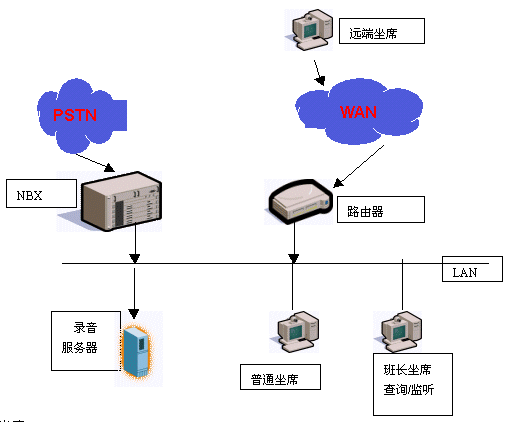 基于3Com NBX呼叫中心的錄音監(jiān)聽系統(tǒng)的拓撲結(jié)構(gòu)圖如下: