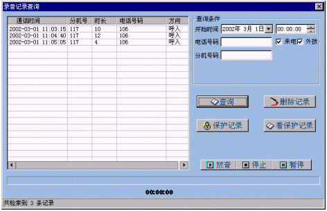 根據(jù)該操作員的類別判定該操作員具有那些權(quán)限(查詢、管理、監(jiān)聽等),具備查詢權(quán)限的操作員可以按時間、分機號、來去點號碼等來查詢所有的錄音信息;具備管理權(quán)限的操作員可以進行操作員管理以及對系統(tǒng)相關參數(shù)的設置;具備監(jiān)聽權(quán)限的操作員可以監(jiān)聽其他坐席的實時狀態(tài)。