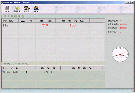 錄音坐席為網(wǎng)音公司開發(fā)的基于3Com NBX wavphone的軟件電話,與pcXset功能基本相同,能實現(xiàn)外撥、應答、掛機、電話會議、呼叫轉(zhuǎn)移、呼叫保持等常用功能。