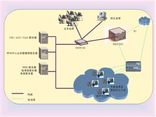 NBX SS3 網(wǎng)絡(luò)電話交換機(jī)作為基礎(chǔ)通信平臺(tái),由北大方正電子技術(shù)有限公司在北京網(wǎng)音公司呼叫中心中間件進(jìn)行集成開發(fā),建立CTI,ACD、IVR、FAX、TTS及其應(yīng)用服務(wù),集成現(xiàn)有的WEB、mail、短消息系統(tǒng),建立統(tǒng)一消息平臺(tái),新建和利用各業(yè)務(wù)數(shù)據(jù)庫,設(shè)計(jì)業(yè)務(wù)坐席及客戶端軟件。