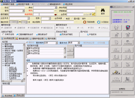 諾和關(guān)懷糖尿病服務(wù)中心的服務(wù)坐席可以實現(xiàn)患者信息的同步提示功能,當電話被分配至坐席的同時,患者的資料信息也同步出現(xiàn)在PC終端上。同時坐席終端可以自動記錄對方的電話號碼,也可以實時顯示正在排隊等待的人數(shù),提示服務(wù)人員加快業(yè)務(wù)受理速度。