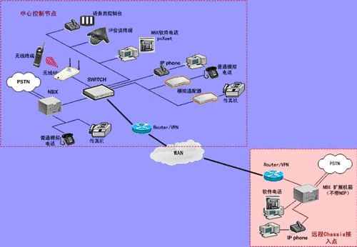 遠端也可以有單獨的 IP 話機(不需要 NBX 呼叫處理器)接入系統(tǒng)。