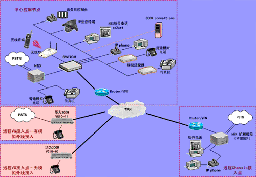 ③.遠程接入的辦公室不再需要專用的 PBX, 只需要將3Com NBX電話終端接入到WAN網(wǎng)中,就能地實現(xiàn)在WAN或Internet上與3Com NBX 網(wǎng)絡(luò)電話系統(tǒng)的互連。
