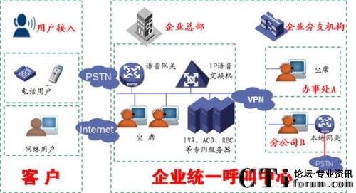 該結(jié)構(gòu)是將呼叫中心的全部設備(設備由網(wǎng)音提供)都部署在用戶現(xiàn)場,用戶可以以企業(yè)總部為核心部署遠點坐席及遠端接入。