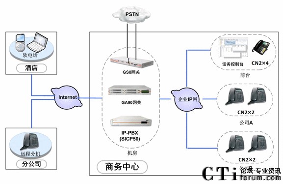中天凱旋利用企業(yè)內部完善的IP通信網(wǎng)絡,在機房部署SICP系統(tǒng),負責整個語音通信系統(tǒng)的服務管理、用戶管理。部署GA90網(wǎng)關和GS8網(wǎng)關,分別使用E1中繼線路和普通模擬線路接入PSTN網(wǎng)絡,保證系統(tǒng)的通信。