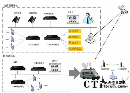 整體系統(tǒng)由地面指揮中心和指揮通信車組成,指揮中心和通信車分別部署調(diào)度臺,均可指揮現(xiàn)場。地面指揮中心和指揮通信車通過部署衛(wèi)星設(shè)備,通過衛(wèi)星鏈路進(jìn)行通信,當(dāng)衛(wèi)星鏈路出現(xiàn)故障時,指揮車也可通過移動網(wǎng)絡(luò)(GSM/CDMA/3G)與地面指揮中心互聯(lián)互通。