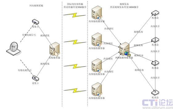 帶寬接入:用于國內(nèi)到國際的出口帶寬,使用大小為50M獨(dú)享,以滿足在有效時(shí)間內(nèi)可完成所有內(nèi)容的傳輸;用于國外用戶響應(yīng)發(fā)布的P2P流媒體服務(wù)器出口帶寬為100M,可滿足至少2000并發(fā)用戶的P2P直播點(diǎn)播觀看需求。
