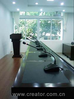所以在本會議室配置了1臺標準的會議討論型控制主機臺CR-M4101,1臺座式的主席機CR-M4102B,9臺座式的會議代表機CR-M4104B,另外還有連接電纜等。主席機具優(yōu)先控制權,設置主席位置,并且可以移動,代表機分別設置其余數(shù)個話筒點。采用手拉手方式,一條總線即可連接所有會議討論設備,布線簡單快捷。通過專業(yè)的音頻輸出口和音響擴聲系統(tǒng)結合,清晰、明亮的將發(fā)言人的聲音重放出來。