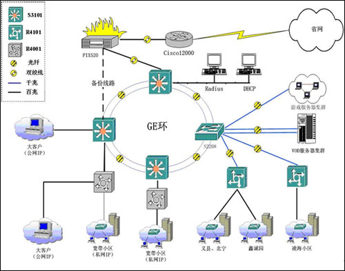此城域網(wǎng)結(jié)構(gòu)清晰,由核心層的三層交換機(jī)只負(fù)責(zé)數(shù)據(jù)的快速轉(zhuǎn)發(fā),對業(yè)務(wù)匯聚和用戶的認(rèn)證控制任務(wù)全部由接入服務(wù)器R4000來完成。要求接入服務(wù)器支持多種認(rèn)證手段、加強(qiáng)對各類用戶實現(xiàn)不同級別的控制、為用戶的訪問提供安全保障措施、結(jié)合Radius系統(tǒng)提供多種計費功能。