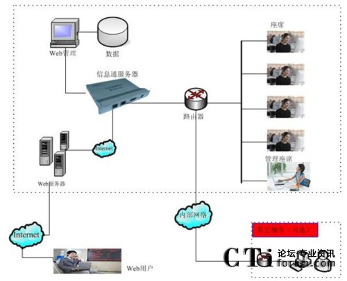 信息通系統(tǒng)的軟硬件部署,主要包括三個(gè)部分:信息通用戶工作平臺(tái)(客戶端)、信息通服務(wù)器(嵌入式設(shè)備)、數(shù)據(jù)/文件/管理服務(wù)器(其它應(yīng)用)。其中,在實(shí)際應(yīng)用中,信息通服務(wù)器與數(shù)據(jù)/文件服務(wù)器可以根據(jù)實(shí)際情況整合為一臺(tái)服務(wù)器。另外,整個(gè)系統(tǒng)通過(guò)應(yīng)用網(wǎng)關(guān)——信息通服務(wù)器設(shè)備——與Internet連接,所以,信息通服務(wù)器與應(yīng)用服務(wù)器為同一臺(tái)服務(wù)器。
